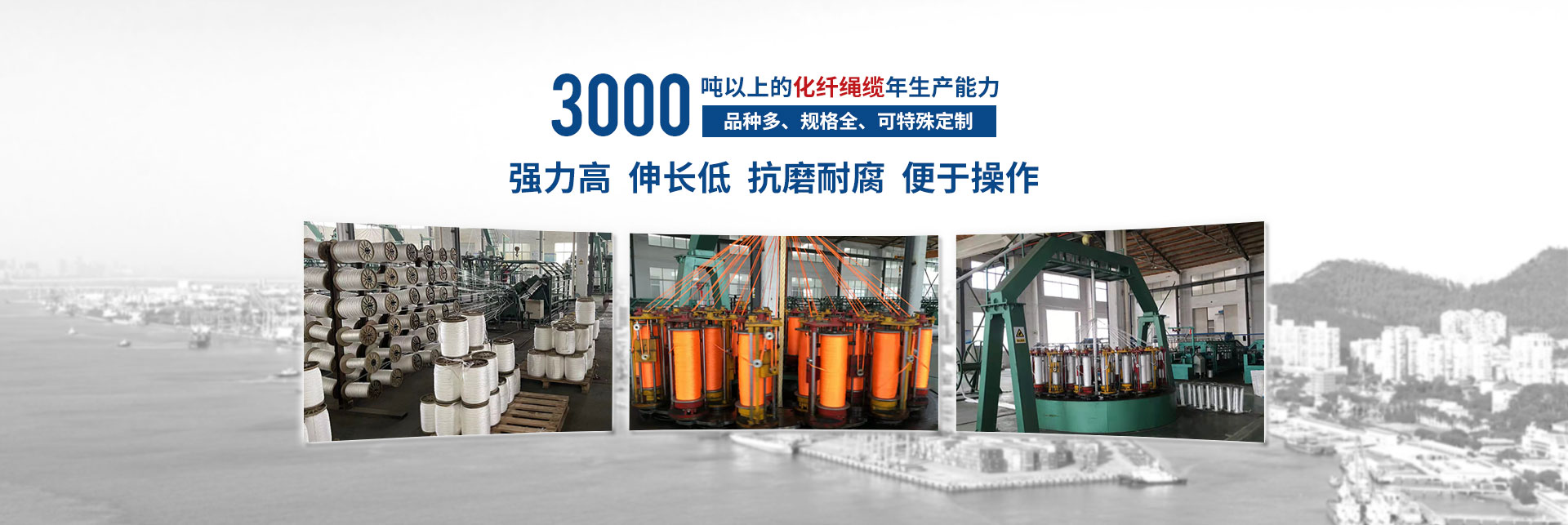 揚(yáng)州神龍繩業(yè)有限公司,位于江蘇中部古城揚(yáng)州北首,古運(yùn)河畔,中國(guó)“荷藕之鄉(xiāng)”-寶應(yīng)城西工業(yè)集中區(qū),該園區(qū)是省市中小企業(yè)創(chuàng)業(yè)示范基地、揚(yáng)州市優(yōu)化發(fā)展園區(qū)。揚(yáng)州神龍繩業(yè)有限公司是一現(xiàn)代化新型化纖繩纜的生產(chǎn)企業(yè)。交通便捷,京杭大運(yùn)河和京滬高速穿境而過,環(huán)境生態(tài)優(yōu)美。截止2022年12月底,公司實(shí)際擁有固定資產(chǎn)5200多萬(wàn)元,占地建筑面積20000多平方米,標(biāo)準(zhǔn)廠房四棟及水電辦公設(shè)施齊全,機(jī)構(gòu)設(shè)置:經(jīng)理辦、技術(shù)質(zhì)量部、生產(chǎn)部、銷售部、綜合部。公司聘用10名繩纜行業(yè)高級(jí)技術(shù)人員,技術(shù)力量雄厚。擁有國(guó)內(nèi)高速三股機(jī),六股機(jī)、八股、十二股、雙層編織制繩設(shè)備和拉絲設(shè)備。計(jì)量、理化、檢測(cè)手段齊全。企業(yè)已獲得GB/T19001-2016/ISO19001:2015質(zhì)量體系認(rèn)證證書及中國(guó)船級(jí)社(CCS)、法國(guó)船級(jí)社(BV)、挪威德國(guó)船級(jí)社(DNV.GL)、日本(NK)工廠認(rèn)可證書。于2016年12月取得了解放軍裝備承制單位注冊(cè)證書,獲得了高新技術(shù)產(chǎn)品的認(rèn)定證書、江蘇省民營(yíng)科技企業(yè)稱號(hào),并獲得了實(shí)用型專利,“高強(qiáng)度無(wú)捻絲滌綸樹脂插編復(fù)合繩”,專利號(hào)“ZL 2017 2 0221636.8”和多股牽引繩纜、高強(qiáng)度無(wú)捻絲海洋勘探耐磨腐防蝕止合成纖牽引繩高新技術(shù)產(chǎn)品認(rèn)定證書。為祖國(guó)的邊防和航運(yùn)業(yè)貢獻(xiàn)一點(diǎn)力量。按國(guó)際標(biāo)準(zhǔn)生產(chǎn)“繩龍”牌化纖繩纜,品種多、規(guī)格全、年生產(chǎn)能力達(dá)3000噸以上。主要生產(chǎn)錦綸(聚酰銨)、丙綸(聚丙烯)、滌綸(聚酯),超高分子聚乙烯等系列產(chǎn)品,結(jié)構(gòu)有;三股、四股、六股、八股、十二股、雙層編織繩索。規(guī)格從Ф4mm~Ф120mm系列產(chǎn)品任你選擇??筛鶕?jù)客戶需要生產(chǎn)特殊用途規(guī)格繩索。具有強(qiáng)力高,伸長(zhǎng)低、抗磨耐腐,便于操作。產(chǎn)品性能指標(biāo)均符合相關(guān)的國(guó)際標(biāo)準(zhǔn)和國(guó)家標(biāo)準(zhǔn)要求,廣泛應(yīng)用于遠(yuǎn)洋運(yùn)輸、船舶制造、漁業(yè)捕撈、港口作業(yè),國(guó)防軍工、石油勘探等領(lǐng)域,取得市場(chǎng)廣泛認(rèn)可和市場(chǎng)占有率。近年來本公司奉行“以質(zhì)為本,誠(chéng)信經(jīng)營(yíng),優(yōu)良服務(wù),顧客滿意”的宗旨,竭誠(chéng)為廣大用戶提供優(yōu)良產(chǎn)品和服務(wù)。推動(dòng)質(zhì)量管理的深入開展,加強(qiáng)員工的質(zhì)量意識(shí),進(jìn)一步提高產(chǎn)品質(zhì)量,滿足市場(chǎng)和用戶的需求,為用戶服務(wù)。